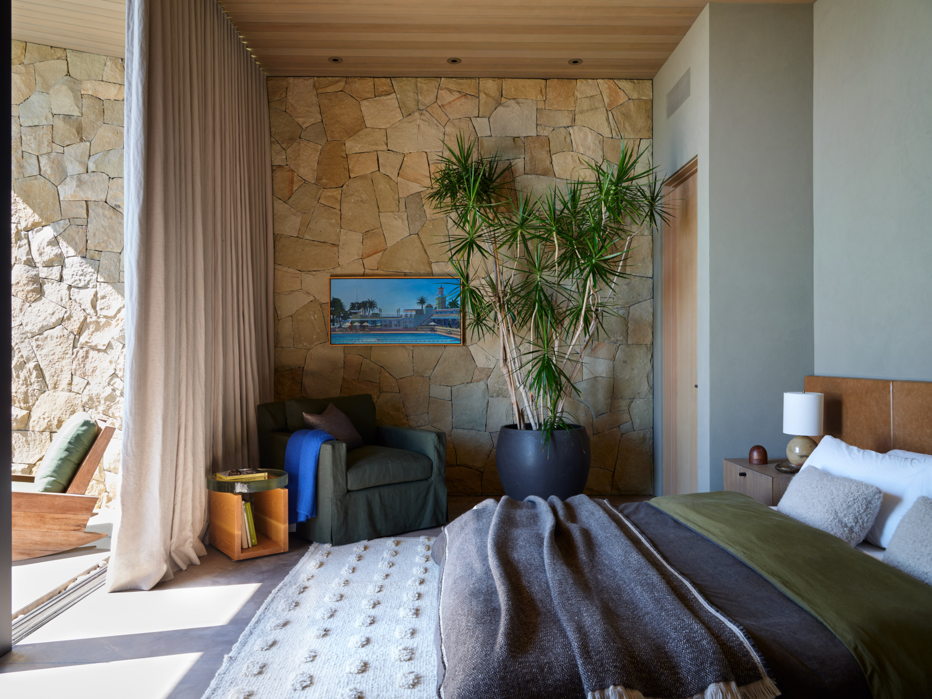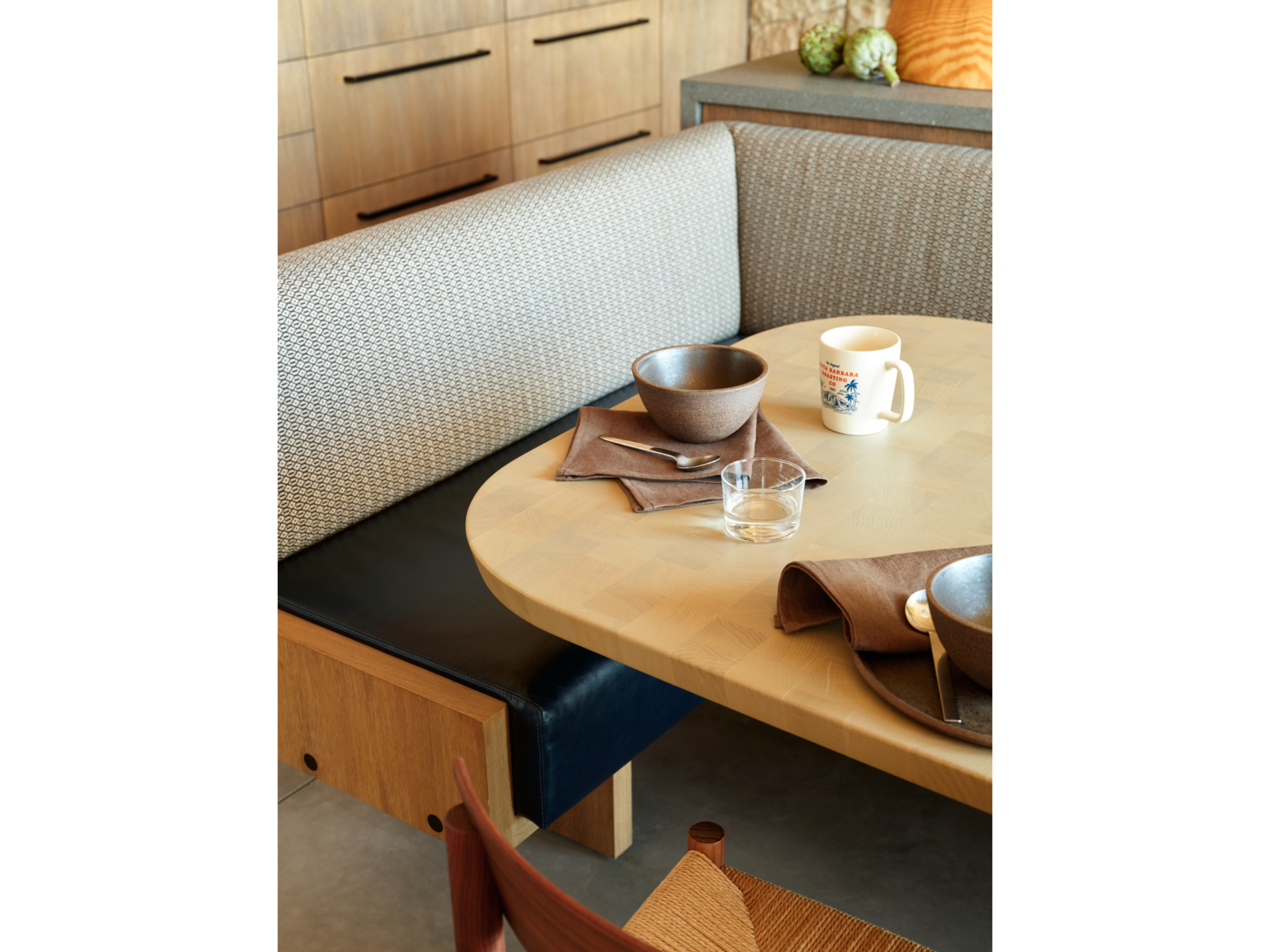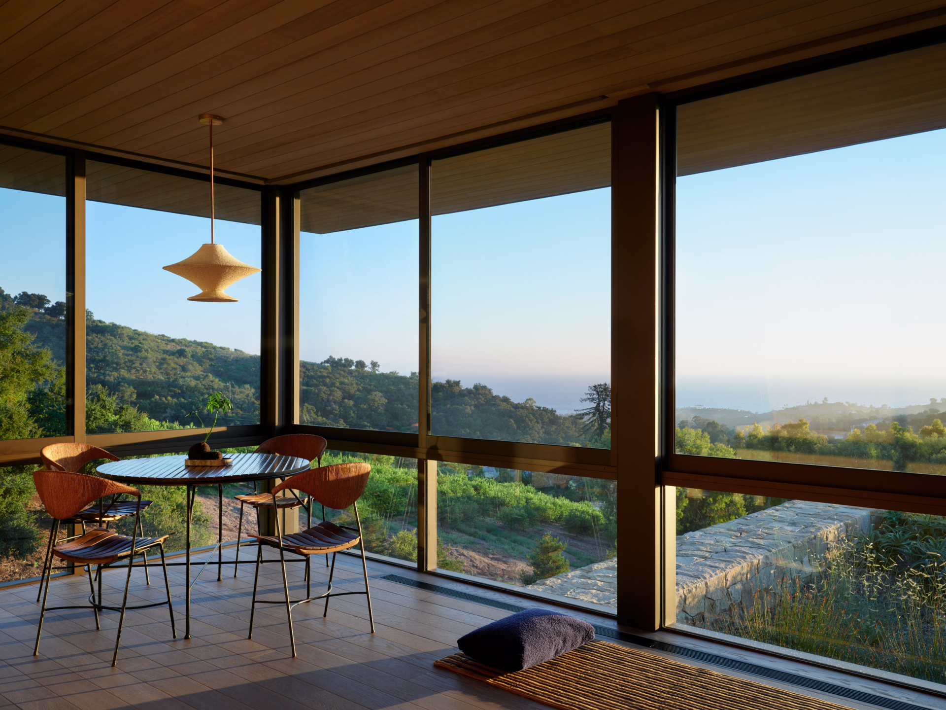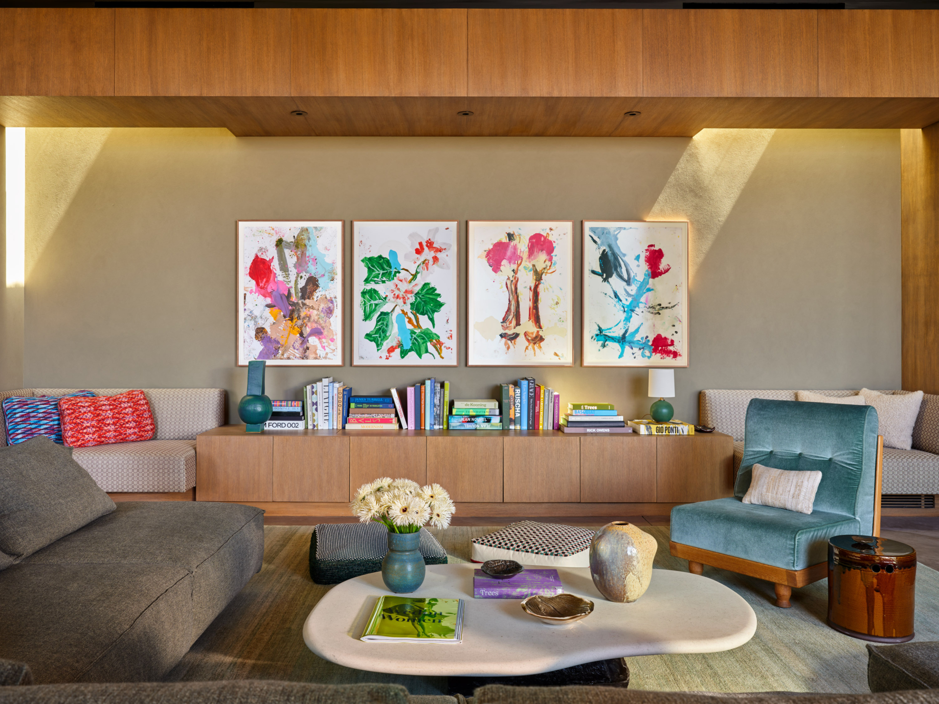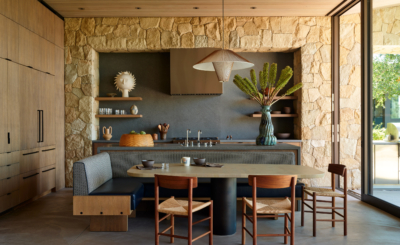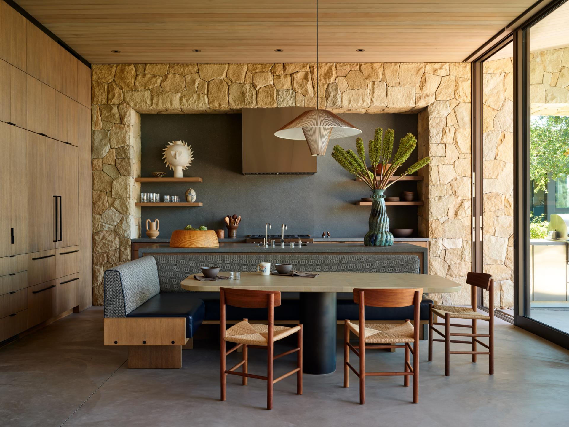 The interior design for this 3,700-square-foot structure accentuates the home’s indoor/outdoor connection and emphasizes its relationship to the site. A palette of warm organic materials harmonizes with the house’s architectural features. A mix of modernist design from the 1960s, contemporary furnishings, and custom furniture, create inviting and comfortable living spaces.