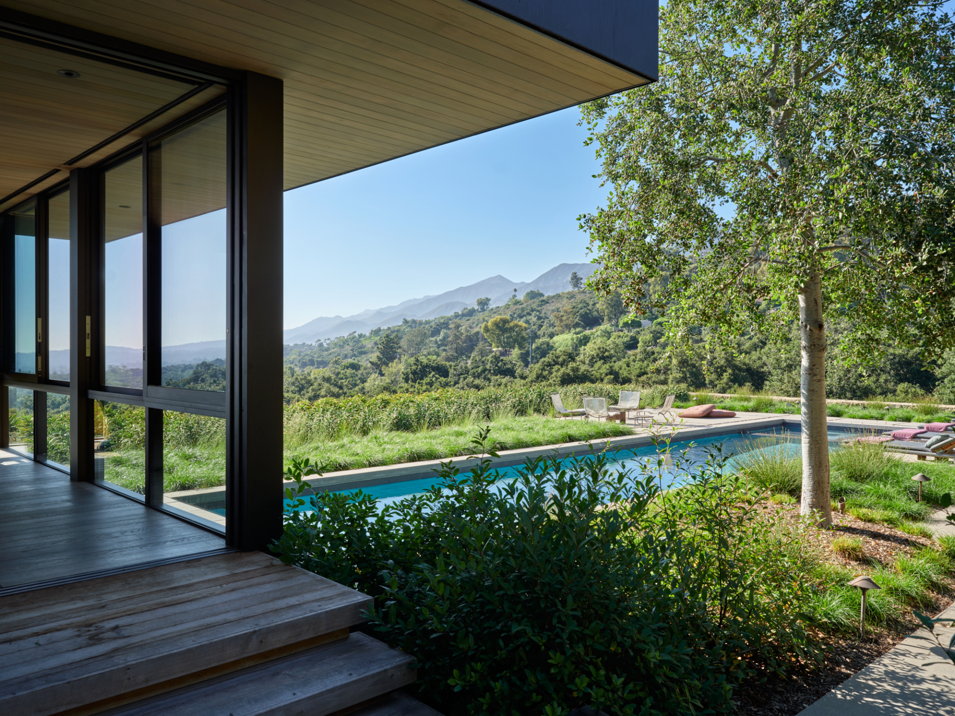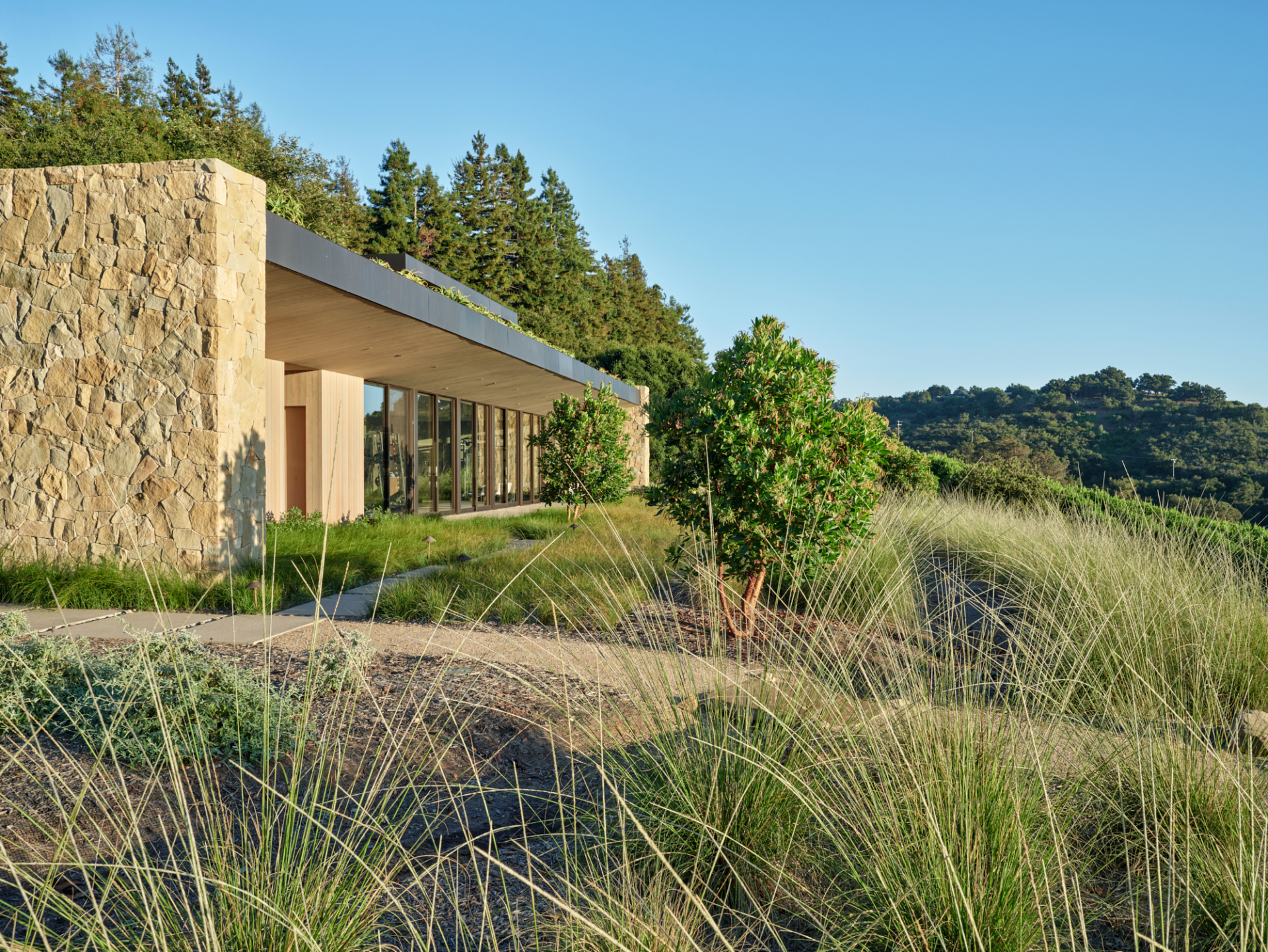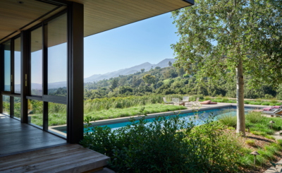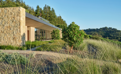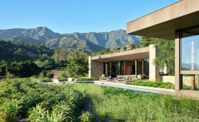 Nestled within a hillside in Montecito, this residence’s landscape architecture emphasizes its connection to its surroundings. The site boasts views of the coastal landscape stretching to the Pacific Ocean. Green roof gardens planted on both levels feature tall grasses, prickly pear cacti and torch aloes, blend the structures with the rolling hills and further integrate them into the site.